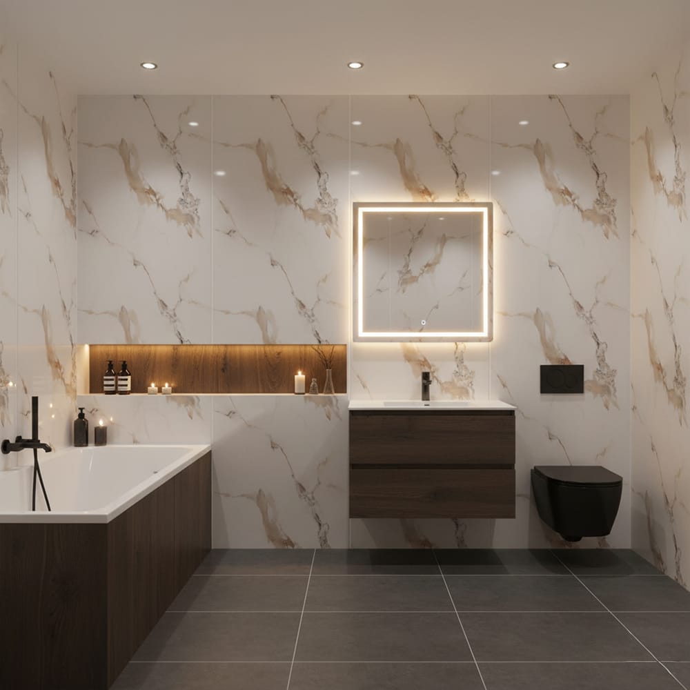 Voor binnenmuren bieden PVC-platen een betaalbare optie voor het creëren van een marmerlook, bijvoorbeeld in keukens of badkamers. Een kosteneffectieve keuze zonder extra belasting voor je muren.